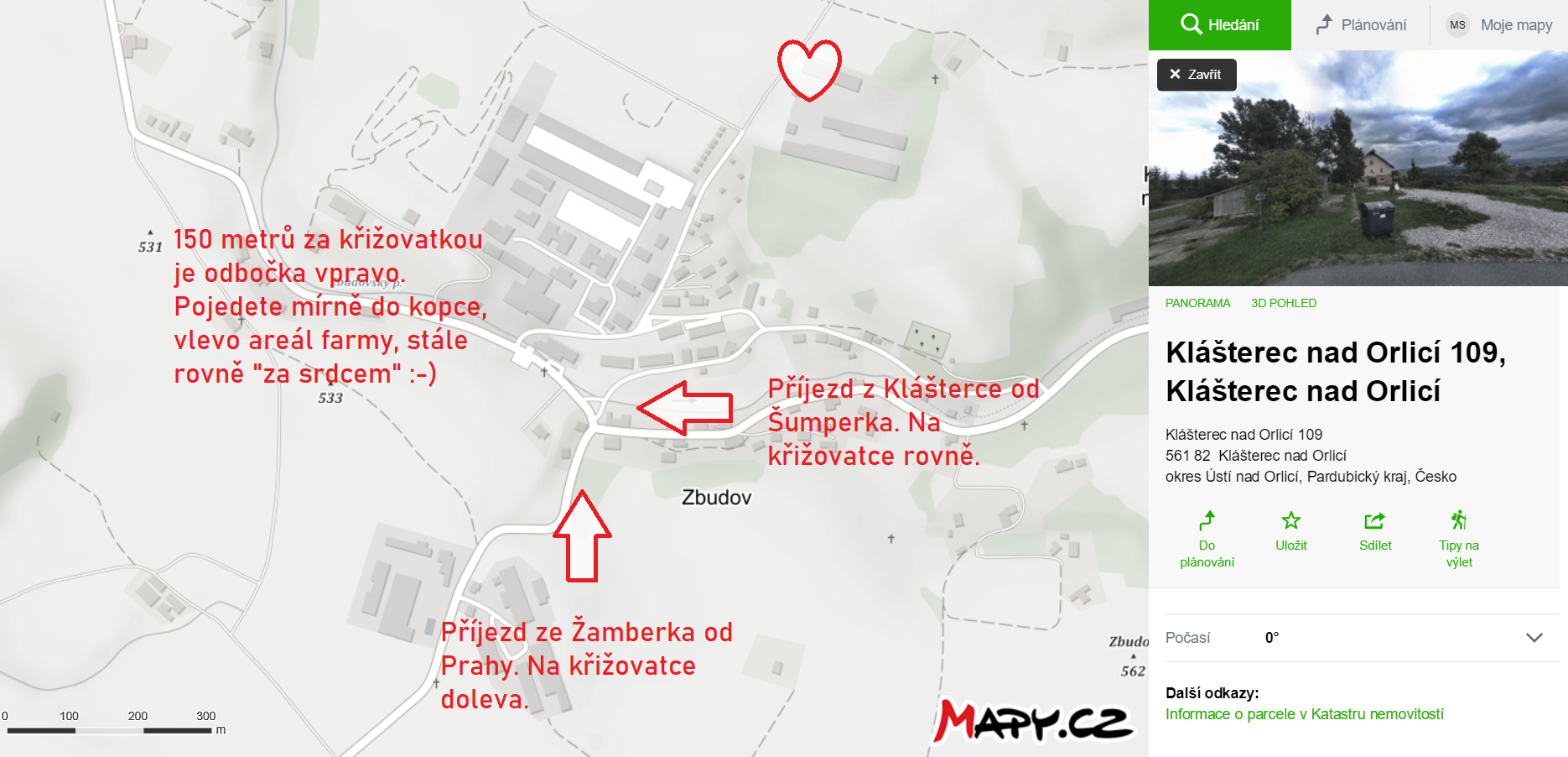Přímo na statku jsou místa k parkování. Autobus na místo nejezdí (jen do nedalekého Klášterce nad Orlicí nebo Zbudova). Dejte vědět, pokud potřebujete zajistit dopravu. Na místo se dá také dojít příjemnou procházkou Přírodním parkem Orlice podél Divoké Orlice po modré turistické značce a dále po neznačené cestě. Je to celkem cca 3 km. Viz mapa dole.